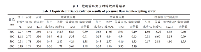 杨根权≌通过研究得出有作用水头的截流管可等效视为一段坡度增大的无压满流管,两者流速相差不大。笔者采用设计截流量 0=350 L/s,截流管长L=20 m,截流管管径 D=300~600 mm,当截流管内水流由重力流变为压力流时,对3种传统截流井实际截流量进行试算,结果见表1。