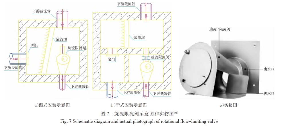在传统堰式截流井内截流管前端安装旋流限流阀,使进水经过旋流限流阀后进入截流管。旋流限流阀工作时利用其腔体内外的进水压力差,使得进水以正切角的方向切入腔体,能精确控制截流量,截流污水能均匀稳定地排放至下游构筑物。旋流限流阀上游需设置必要的拦污设施,保证阀体正常运行。