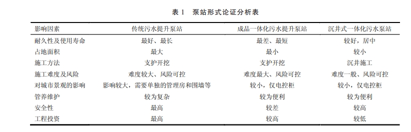 污水泵站主要形式为传统污水提升泵站、成品一体化污水提升泵站、沉井式一体化污水提升泵站等,具体对比情况见表1。3种方案中传统污水提升泵站占地面积最大,投资最高,施工周期长,且不利于城市景观,暂不予考虑。根据勘察资料及现场情况,拟设泵站位置场地相对狭小、靠近河涌,采用开挖施工方式会带来诸多不可预见的情况。考点到泵站规模、场地条件等因素,初步采用沉井式一体化污水泵站。对方案的应用考虑如下。