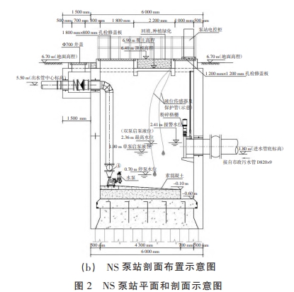 NS 泵站采用矩形布置,占地面积约 49 m。泵站整体采用钢筋混凝土箱体结构,LxBxH=6.0 mx7.0 mx7.5 m,泵站采用全地埋形式,设置3类检修孔,分别为水泵检修孔 LxB=1.8 mx0.8m、清淤孔 Ф700、格栅检修口 LxB=1.2 mx1.2m,平面和剖面布置示意图如图 2所示。为避免同一区域开挖大基坑,泵前检修闸门设置闸站上游 20m污水检查井内,采用圆形闸门,无漏出地埋的操作杆。