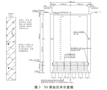 CZ 泵站和 NS 泵站沉井有一定的相似性。以 NS泵站为例,沉井尺寸 LxBxH=6.0 mx7.0 mx7.5 m,采用直壁式侧壁,侧厚度 500 mm,底板厚 500 mm。采用“不排水下沉”法,水下素砼封底厚1100 mm,主体结构采用 C30 混凝土,封底采用 C25 混凝土。地质揭露存在淤泥质土,地基处理进行 Ф500@1 000 高压旋喷桩处理。NS 泵站下沉开挖土层主要为填土、淤泥质土,无邻近需保护建构筑物,不未设挡土周桩。NS 泵站底板与侧壁之间的止水措施采用2道遇水膨胀止水条,效果较好。做法如图3所示。