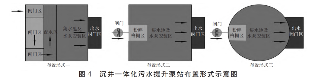 3.4.1 泵站的集约化布置经对比研究,沉井式一体化污水提升泵站主要有以下3种布置形式(图4),其中布置形式一采用回转式机械格栅,将格栅及格栅检修、泵站检修阀门设置在沉井内部,通过内部隔墙分为不同的功能区,不同功能区的高程差异通过素混凝土二次填充实现;布置形式二和布置形式三均采用粉碎格栅,将格栅安装在沉井内壁,将泵站检修阀门井设置在沉井外的第一个污水检查井内,相比布置形式一,布置形式二和布置形式三用地更加集约。3种布置形式的共性是阀门井二次施工浇筑。本研究案例中的CZ泵站属于布置形式一、NS泵站属于布置形式二,从实际设计来看,虽然 NS 泵站规模远大于 CZ 泵站,但得益于粉碎格栅的使用,NS 泵站占地面积比 CZ 泵站更小,。