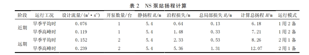 水泵扬程确定是水泵选型的重要考虑因素,水泵的扬程主要由静扬程、沿程损失和局部损失构成,此外,为保障水泵运营安全,一般预留一定的富余水头。在计算水泵扬程时,应分别按近期、远期的旱季平均和旱季高峰等工况进行计算,按最大值选取水泵。当计算的水泵扬程过高时,应通过调整出水管管径的方式降低流速,从而降低扬程。在计算沿程损失时,应采用海曾威廉公式计算。以 NS泵站为例,不同工况下,扬程计算结果详见表2,计算泵站扬程在6.18-12.07m,考虑最不利工况扬程为 12.07m,预留2m左右富余水头,最终选取水泵扬程 日=14m。在选用水泵时,优先选择带切削功能的变频泵。当泵站服务分区内存在合流区时,还应考虑雨季运行工况下扬程的复核。