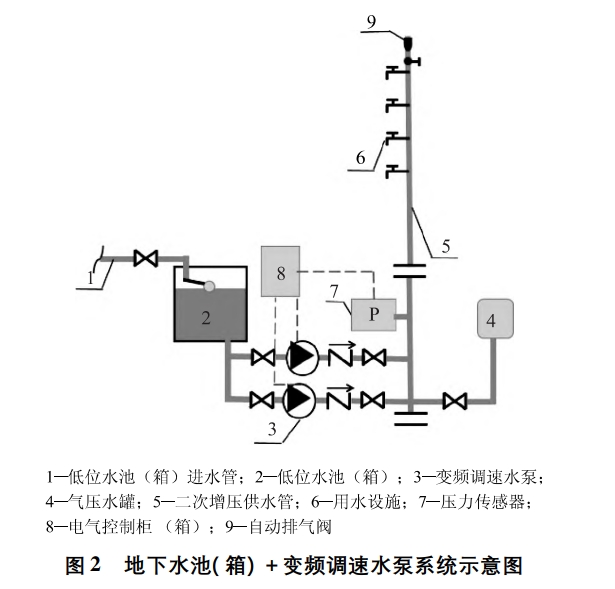 (3)保障消防系统。对于生活消防合用的供水系统,为避免影响消防系统的正常运行,应尽量避免改造中牵动消防系统。水池生活消防合用时,若泵房空间充足,优先考虑单独设置生活水箱,反之优先考虑叠压供水方式;水泵生活消防合用时,优先考虑重新设置生活水泵,将原水泵留作消防用。2.2 地下水池( 箱)+ 变频调速水泵供水由水泵从地下水池(箱)取水,通过变频器改变供电频率控制水泵电机转速,使水泵转速和流量可调节,由水泵、控制柜(含变频器)、压力检测仪表、管路、阀门等组成,如图2所示