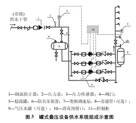 管道直联叠压供水技术继水箱、工频水泵、变频调速水泵后发展的直接串接到市政给水管网的引入管或有压管道上加压的新型给水设备,可充分利用市政供水管网的压力,减少水泵扬程,节省电耗;省去地下水池(箱)、吸水井等构筑物,节省投资,简化系统“;可防止水在地下水池(箱)等构筑物中的二次污染和可能的溢流水损失,方便管理维护,便于水泵自动控制。其中罐式叠压供水采用稳流补偿器(压力罐)做调蓄设施的叠压供水设备,主要由稳流罐、变频调速泵组、气压水罐、变频控制柜、管道、阀门及仪表等组成,基本组成如图3 所示。