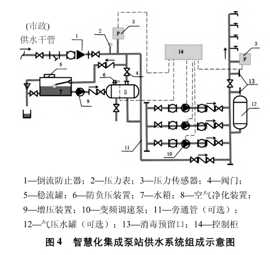 智慧化集成泵站整体形式与箱式叠压较为相似,市政来水进入一体式水箱,变频泵抽取水箱内生活用水并加压向用户供给,控制柜中设有更新程序,定时循环低位水箱中的水,保障饮水安全。系统主要由低位水箱、主泵机组、变频控制柜、增压装置、引水装置、稳流罐、流量控制器及压力传感器等组成。智慧化集成泵站供水系统的基本组成如图4所示。
