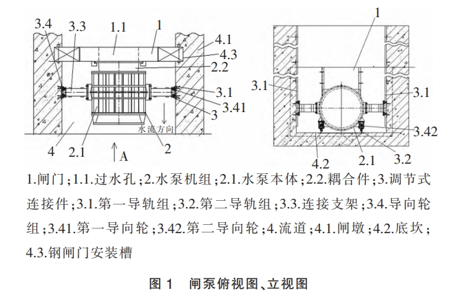 闸泵一体化泵站,通过利用泵站的水泵流道及增设控制流道闸门实现闸泵一体化布置。闸泵一体化泵站,将潜水电泵直接设置在钢闸门上,钢闸门既是挡水结构又是潜水电泵运行时的受力结构,钢闸门及潜水电泵重量分别超过10t时,闸泵一体化设计对设备升降安装造成极大困难,并导致设备安装及维护工艺复杂,