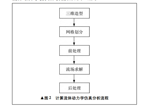 一体化预制泵站内部的流态优劣取决于污水泵进水口的入流条件。在污水泵提升污水时,应用计算流体动力学方法分析一体化预制泵站筒体内部的流场,以此来观察泵站的运行流态。笔者采用国际上运用广泛的 ANSYS 有限元分析软件,对一体化预制泵站进行计算流体动力学仿真分析,过程主要包括三维造型、网格划分、前处理、流场求解、后处理五个阶段!。计算流体动力学仿真分析流程如图2所示。