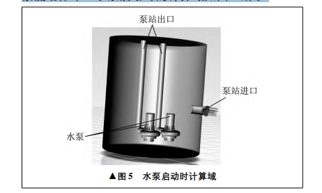采用 ANSYS CFX 流体分析及仿真软件对一体化预制泵站内部流动进行计算流体动力学仿真分析。根据泵站内部流体流动的特点和对计算结果收敛性的预期,将泵站进口流速设置为恒定速度,将出口流速设置为自由流出,叶轮与静止部件间的交界面设置为转子冻结,其余固体壁面均设置为光滑无滑移壁面条件,同时开启两台水泵进行计算流体动力学仿真分析,观察流场分布。水泵启动时的计算域如图 5 所示。