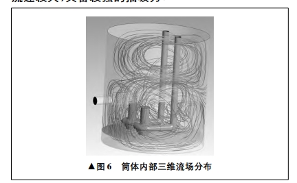 筒体内部三维流场分布如图6所示。通过泵站在启动状态下筒体内部三维流线及速度矢量分布,可以看出水流从泵站进口流入后,均匀流向水泵两侧,水泵吸入口的入流未出现明显湍流现象,水泵吸入口附近流速较大,具备较强的抽吸力。
