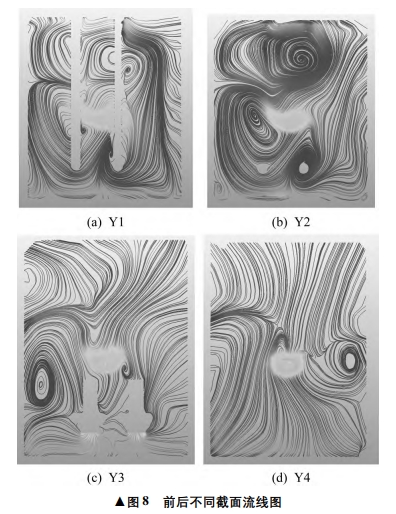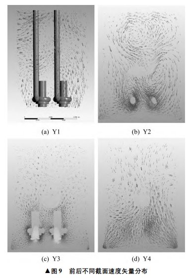 为了更仔细地观察筒体底部流场,分别在筒体内部前后不同位置设置截面,查看流线和矢量分布。前后不同位置截面如图7所示,从前往后依次为Y1~Y4截面。前后不同截面流线图如图8所示,速度矢量分布如图9所示。