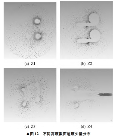 筒体内不同高度截面如图10 所示,从下往上依次为 Z1~Z4 截面。查看不同高度截面上的流线及矢量分布,不同高度截面流线图如图 11所示,不同高度截面速度矢量分布如图 12 所示: