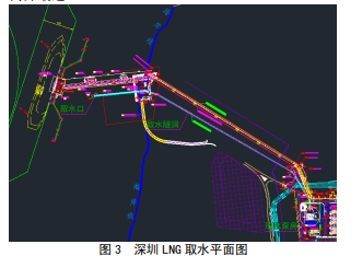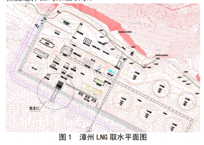 按照深圳 LNG 项目的总体规划,海水取水口布置在港口码头栈桥的东南侧海岸边,此处地形特点是海岸陡峭,岩石山体下即为大鹏湾海域,水面以下海底坡度较大,在距海岸边 170m 左右即为海域的深水区。取海水泵房布置在接收站西北角,此处距离海水出口闸门井最近。