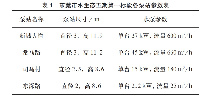 东莞市水生态五期第一标段位于东江南部泛洪区,主要河流包括寒溪河和石马河,工程所处的河口三角洲河涌密布。属于南亚热带海洋性季风气候。全镇降雨充沛,多年平均降水量1970mm。雨量常年集中在4-9月份,占全年降水量的 87.6%。为节约工程投资,减少管网平均埋深,城市污水管网一般设计提升泵站接力排水,在低洼地段污水难以排入污水处理厂,也需要设计提升泵站。近年来随着环境保护要求的提高泵站的稳定运行显得尤为重要,而泵站稳定运行的保证需要多种措施并用,设计主要是对各类垃圾的防治,避免堵塞污水管网及水泵,过程安装工作也要对质量安全细致考虑。东莞市水生态五期第一标段各泵站设备参数见表1。