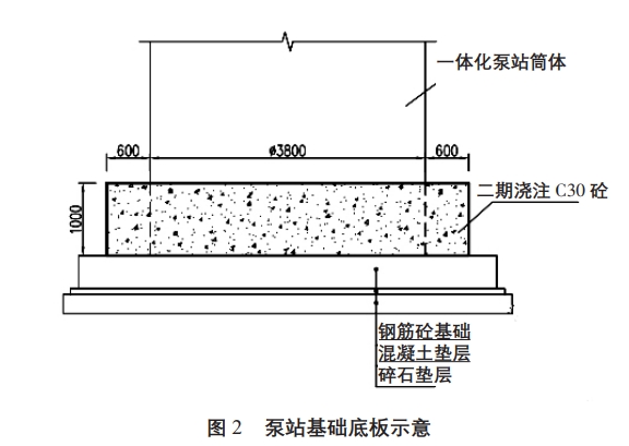 一体化泵站主体的底座和钢筋混凝土底板应牢固连接,连接形式应根据抗浮计算和水泵稳定运行要求共同确定,浇筑混凝土时必须保证地面平实,地某承载力基本容许值应大于等于150KPa,本工程设计的泵站主体底板如图2所示