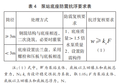 2.1.2 泵站底座结构设计要求泵站底座结构为防止水泵固定处产生震动和共振,需进行防震复核,同时考虑地下水对筒体的影响,进行抗浮复核,处理方式及要求见表 4。