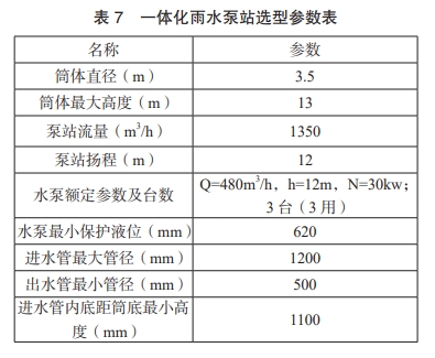 根据需要一体化泵站的流量和扬程可以在图集选型表中确定主要参数,进行后续集水池有效容积及液位的计算。张孔峰四认为当下一体化泵站的有效容积确定依据不足,胡凯 [0对一体化泵站的有效容积进行了优化设计。基于此,综合规范和图集要求,通过集水池有效容积确定有效水深,进而确定三大液位后,利用 19CS03-2 和 20CS03-1 图集中“进水管内底距筒底最小高度”这一参数复核三大液位,最终再反推有效容积和有效水深。以某一体化雨水泵站为例,已知流量为1350m'hh,扬程为 12m。主要选型参数如下表7。