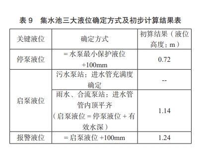 集水池内三大液位由低向高依次是停泵液位、启泵液位和报警液位。各液位确定方式及初步计算结果见表 9。