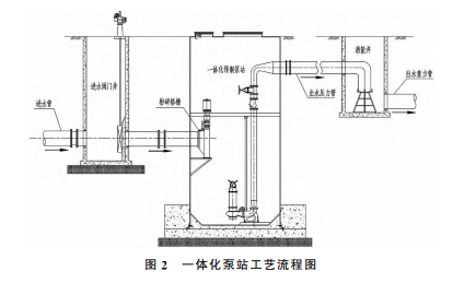 根据一体化泵站工艺要求,在泵站前设置进水阀门井,在泵站后设置消能井,工程流程设计如图2所示。