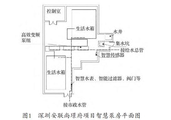 二次供水智慧泵房通过对用户的感知、智能识别、供电保障、人机互动、水质保障、能耗管理降噪减震等数据,实现视频实时采集、存储、传输、处理等功能。智慧泵房由供水设施、控制系统和相应的管理系统组成。深圳安联尚璟府项目智慧泵房平面图如图1所示,