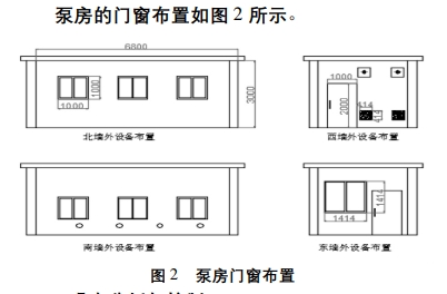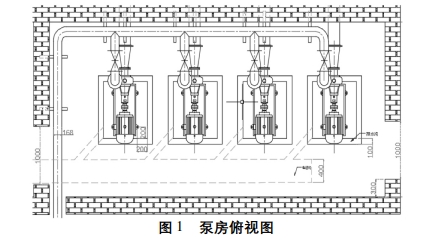 一个合理的泵房是整个泵站高效运转的保证。泵房是安装水泵、电动机、水泵控制柜及其他辅助设备的建筑物,是水泵站工程的主体,合理设计泵房,对节约工程投资,延长设备使用寿命,保证安全和经济运行都有重要意义。1 泵房内机组的布置本设计以4台4PW 型号污水泵为例,采用纵向排列,对于顶进侧出的水泵,纵向排列可保证吸水管顺直状态,降低泵房长度,如图1所示