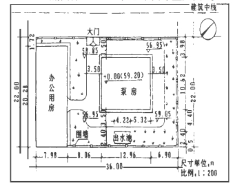 本立交雨水泵站位于北京市丰台区杜家坎铁路立交西南侧,东邻京广铁路,北邻铁路立交西南侧桥栏杆,南侧围墙外为铁路局养护队住房,西侧为泵站出口,与现况公路相接,占地 792m',建筑面积 310m?其主要建筑物为雨水泵房,采用半地下式;地上部分为砖混结构,地下部分为钢筋砼结构,长11.2m,宽11.1m,至底面深9.6m,工程总平面布置见图 1