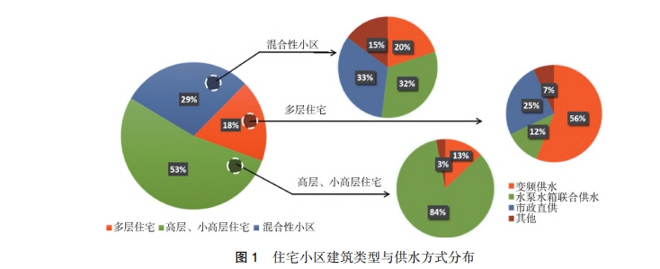 2000 年后建成住宅小区的建筑类型分布与供水方式如图1所示。数据显示,2000年后建成住宅小区主要以高层住宅(8层及以上)为主,高层与多层(8层以下)并存的混合住宅小区次之,多层住宅小区最少。供水方式上,多层住宅小区以市政直供和变频供水为主,占小区总数的 81%,但仍有 12%的小区为水泵水箱联合供水:高层住宅以水泵水箱联合供水为主,占小区总数的 84%,约 13%为变频供水。